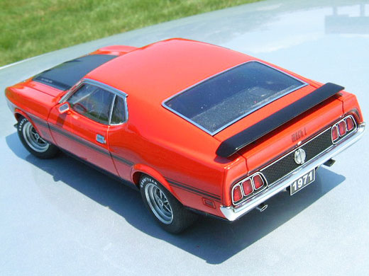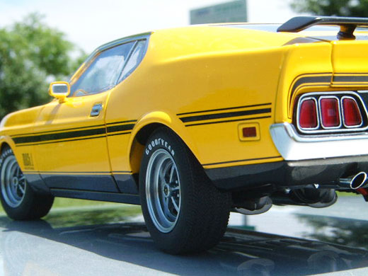 Through & through, the AutoArt replica of the 1971 Mach 1 is arguably their best work to date. On the outside, the artisans at AutoArt have captured the look of the 1971 Ford Mustang Mach 1 dead on, from the body lines to the stance of the car. Authentically finished in your choice of Bright Red or Grabber Yellow, the paint quality on these Mustang diecast model cars is top notch. Not only are the AutoArt craftsmen top painters, but they have also done an equally amazing job replicating the remainder of this Ford pony car's exterior with tight shut lines, accurately placed & flawlessly implemented Mach 1 & Ram Air tampos & side stripes, rear & front chin spoilers, a delicate honeycomb grille as well as the Mach 1 authentic molded honeycomb pattern in the rear panel between the triple segmented tail lights. Speaking of lights, another forte on any AutoArt diecast model car are the front & rear lights, and the jewels on the Mach 1 are no exception. There are many other collectible manufacturers that should take note. Add to an already stunning exterior several chrome plated accents from the replicated twist & lock hood pins to the front grille & rear tail light panel trim, and you have yourself a handsome award-worthy diecast replica from AutoArt. The only bone for contention on the exterior is the chrome plated front bumper. According to many articles & other records, the 71 Mustang Mach 1 came with a color-keyed front bumper. While the possibility of optioning a chrome front bumper from the Ford dealer has yet to be proven one way or another - anything was possible back then - this possible oversight in no way detracts from what is arguably an attractive museum quality diecast piece. And surprisingly, all of this magnificence can be had at a not so museum quality price. Is AutoArt the best bang for the buck? Buy one of these Mustang models and see for yourself.