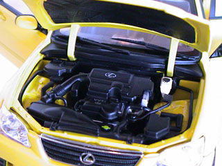 The Lexus IS-300 was introduced in the US as a direct shot at BMW’s 3-Series, and Audi’s A4 range. This car succeeded because of its sporting nature, and chic styling. This is my the first AUTOart diecast model car that I've owned, although I’ve seen and handled many. I had very high expectations for this model, and they were definitely met, and here’s how: Starting off where I always do, (the wheels and tires), this car fails to impress. There are nice brake discs and calipers, excellent wheels, but in this price range, the tires are completely anonymous. I expected more for the money. The rest is wonderful. There are excellent headlamps, firmly secured, and drop-dead gorgeous. The grille is accurate, and the logo is very nice as well. The rear is my favorite part of the design. The tail lights are extremely well-done...they look very realistic. The tailpipe is good, and the logo and name are present. The rear window features a nicely-done sunshade, with accurate spacing and colors.
