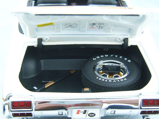 Those familiar with previous Oldsmobile offerings from Lane will find nothing astonishingly new under the hood, in the interior or in the trunk, but those not familiar are in for a treat. The engine is a splendidly built replica of the Olds 455ci V8, resting among a miniature jungle of wires & hoses. Here you'll find heater hoses, radiator hoses, spark plug wires, plus a wired master cylinder with properly routed brake lines. The engine compartment is completed with a detailed firewall, black inner wheel wells, a detailed air cleaner lid, a detailed battery with battery cables, even a half empty washer fluid reservoir that has a miniature line running out of it. On the opposite end, the opening trunk is a little more organized than the engine bays wild kingdom of wires & hoses, but rightfully so. Inside the opening trunk, you'll find a spare gold painted Olds Rally wheel wrapped in an authentic Goodyear Polysteel tire, along with a jack and jacking instruction labels found on the underside of the trunk lid.